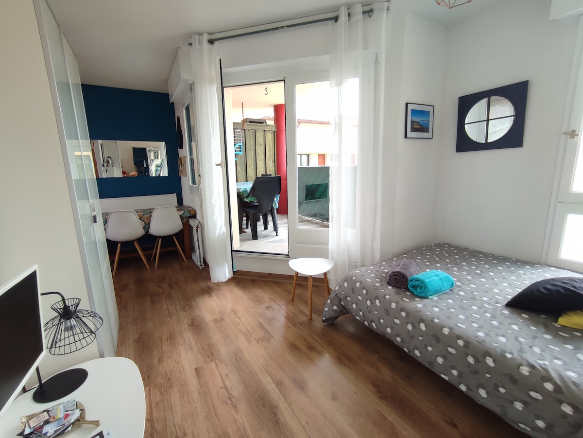 Studio/chalet récent de 26 m² avec patio de 15 m2 à Biscarrosse bourg à 15mn en voiture de l'océan et du Lac. Dépendance mitoyenne à ma maison dans rue très calme à 2 mn du centre - Entrée autonome/portail/jardinets indépendants - Chambre avec lit 140 + salle d'eau + wc. Draps et serviettes fournis. Cuisine équipée. Ravissant patio avec table, chaises, transats, parasol. Animaux acceptés.
