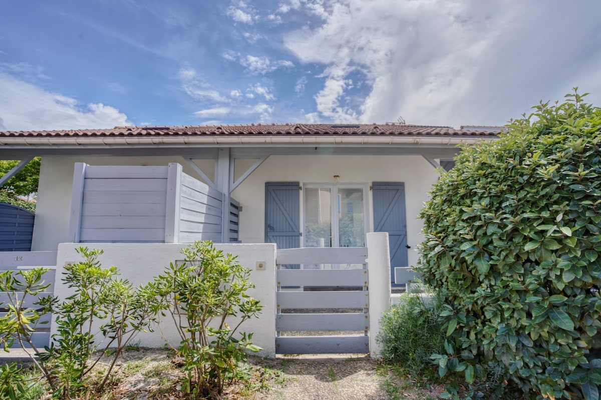 Maisonnette plain pied climatisée, chambre séparée, belle terrasse privative non herbeuse, équipée d'un barbecue. Notre maisonnette se situe dans un quartier résidentiel très calme avec accès sécurisé , à 10mn de la plage, piste cyclable à proximité Composée de : - Une chambre lit de 160 - Pièce principale avec coin salon - Cuisine équipée et LV - Douche à l'italienne, lave linge, WC indépendant - Draps fournis - Serviette non fournies - 5€ pièce - Arrivée: 16 h00 - Départ: 11h00