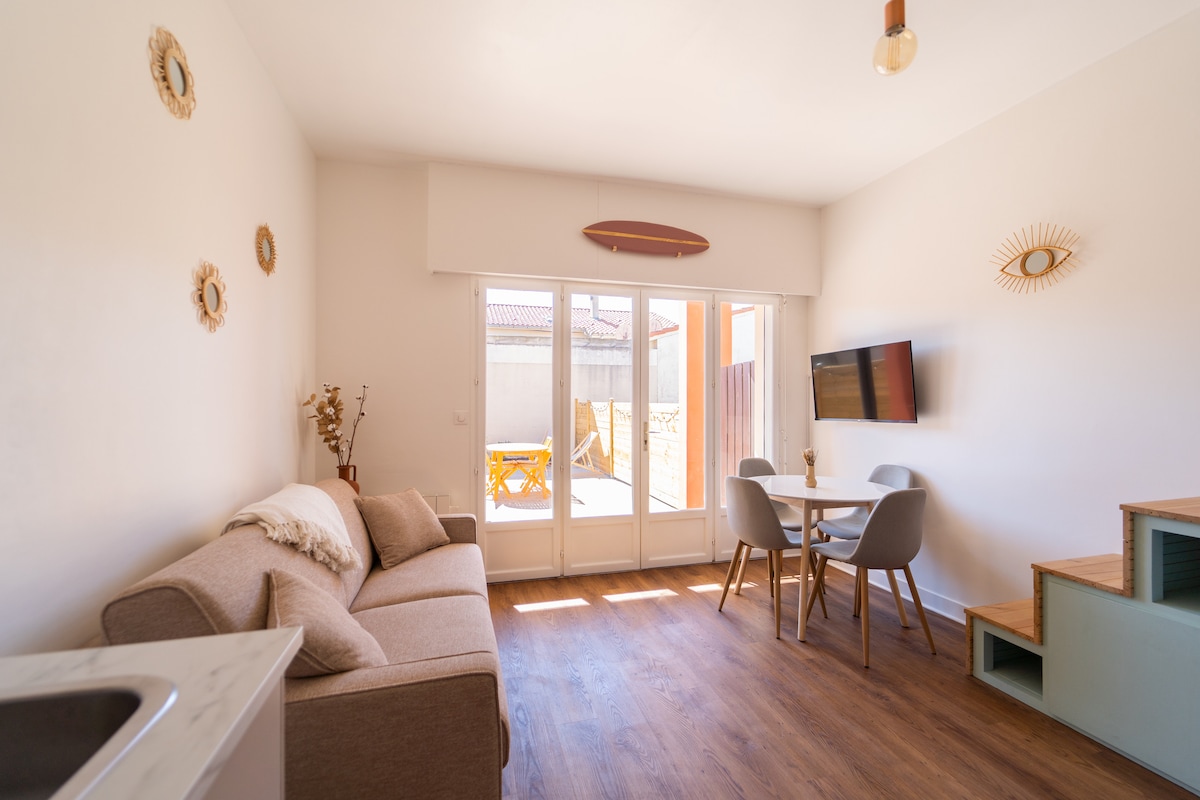 Besoin d'un bol d'air frais océanique ? Pensez à ce jolie studio totalement rénové de 20m², lumineux à deux pas des plages ! Pouvant accueillir jusqu'à 4 personnes. Idéalement situé, vous pourrez profiter de sa terrasse de 13m². Le logement est très bien équipé wifi, télévision, mini four, WC séparé. Vous êtes également à 10 minutes du lac de biscarrose (parc aquatique, paddle) et à 30 min de la Dune du Pilat.