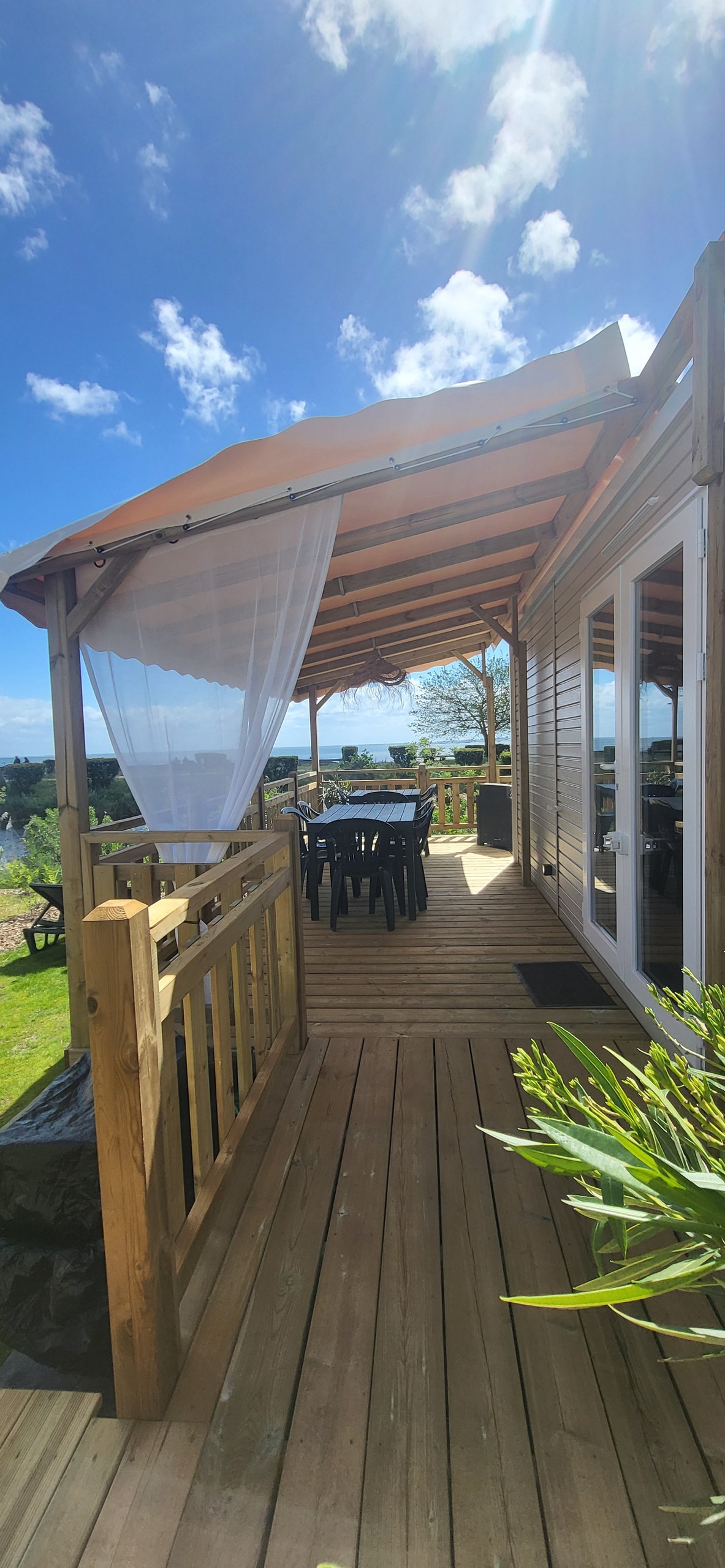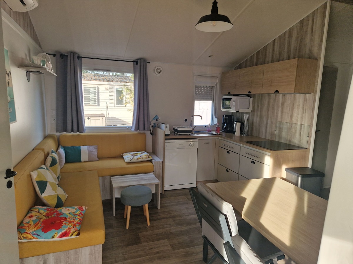 Venez profiter de ce mobil-home de standing, seul(e), en famille, en amis(es) ou avec votre animal de compagnie. Le mobil-home climatisé dispose de 3 chambres et d'une cuisine entièrement équipée ( lave-vaisselle,micro-ondes, four,Airfryer, Senseo, ustensiles de cuisine...) La chambre parentale dispose d'un dressing avec un lave linge. 1 chambre avec 1 lit superposé 1 chambre avec 1 lit simple et 1 lit gigogne La terrasse de 18 m²couverte est composée d'une table avec 8 chaises et d'un salon.