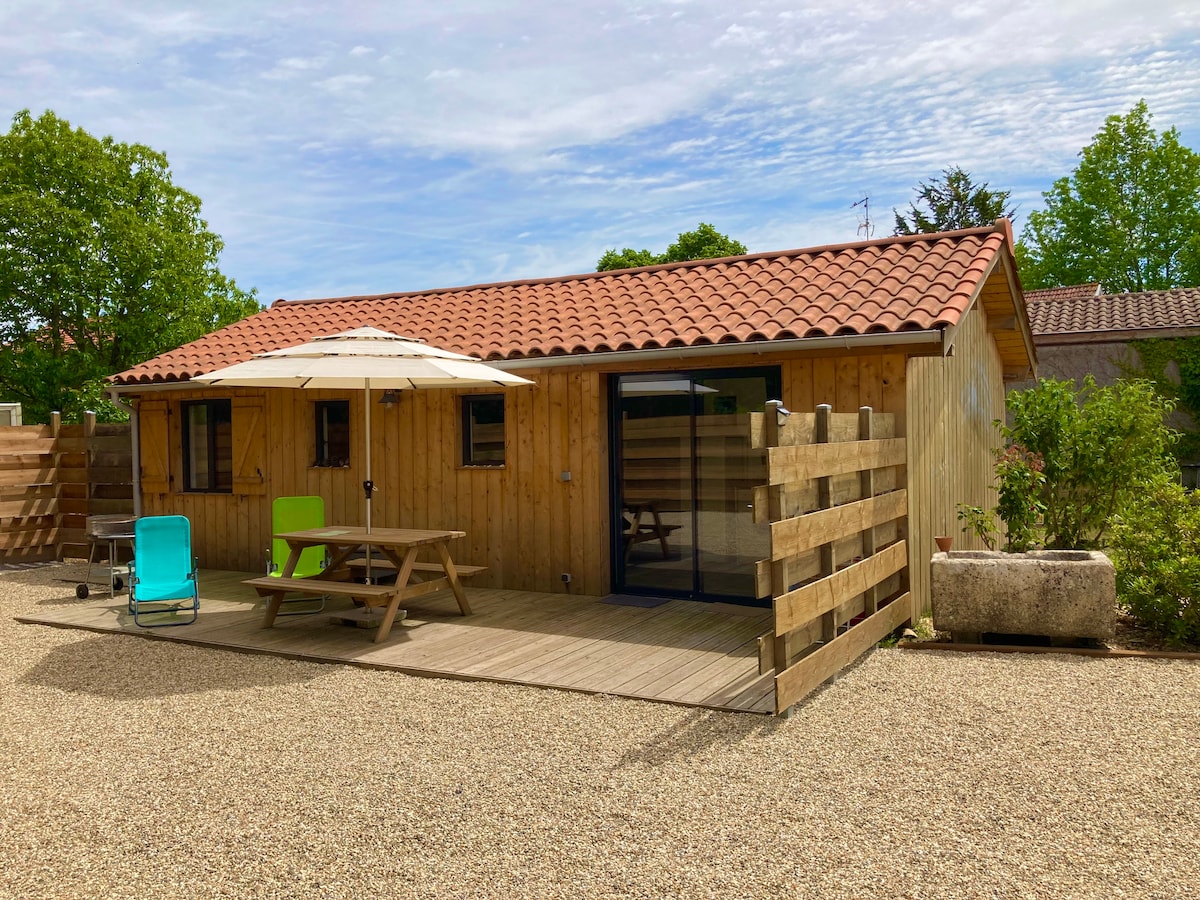 Au cœur du Bassin d'Arcachon, chalet de 49m² avec terrasse couverte, situé sur la propriété d'une villa. A 1 km de tous les commerces, des pistes cyclables, des parcs de loisirs, à 10km d'Arcachon, à 12km de la Dune du Pilat et plages océanes. Cuisine équipée, SDB, WC, douche, serviettes,lave linge. 2 chambres lits 160x200 avec draps. Petit jardin privatif, transats, plancha,parking privé fermé avec vidéo JACUZZI FERMÉ DE NOV À AVRIL, en supplément de 20€ la séance et uniquement sur réservation