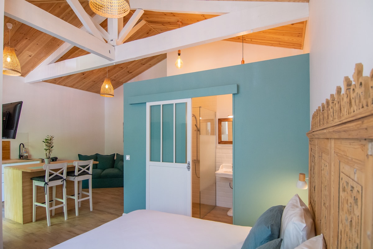 chalet climatisé au bord d'une piscine, dans un joli jardin au calme, équipé d'un lit double en 140 cm, d'une salle d'eau avec wc, d'une kitchenette avec frigo, plaque electrique, four, micro onde, cafetière nespresso, grill pain, presse fruit Petit écran plat avec TNT, Wifi Le linge est fourni y compris serviettes de bain piscine La piscine, les transats sont à partager avec les propriétaires Une place de parking non fermée est disponible Une plancha est mise à disposition