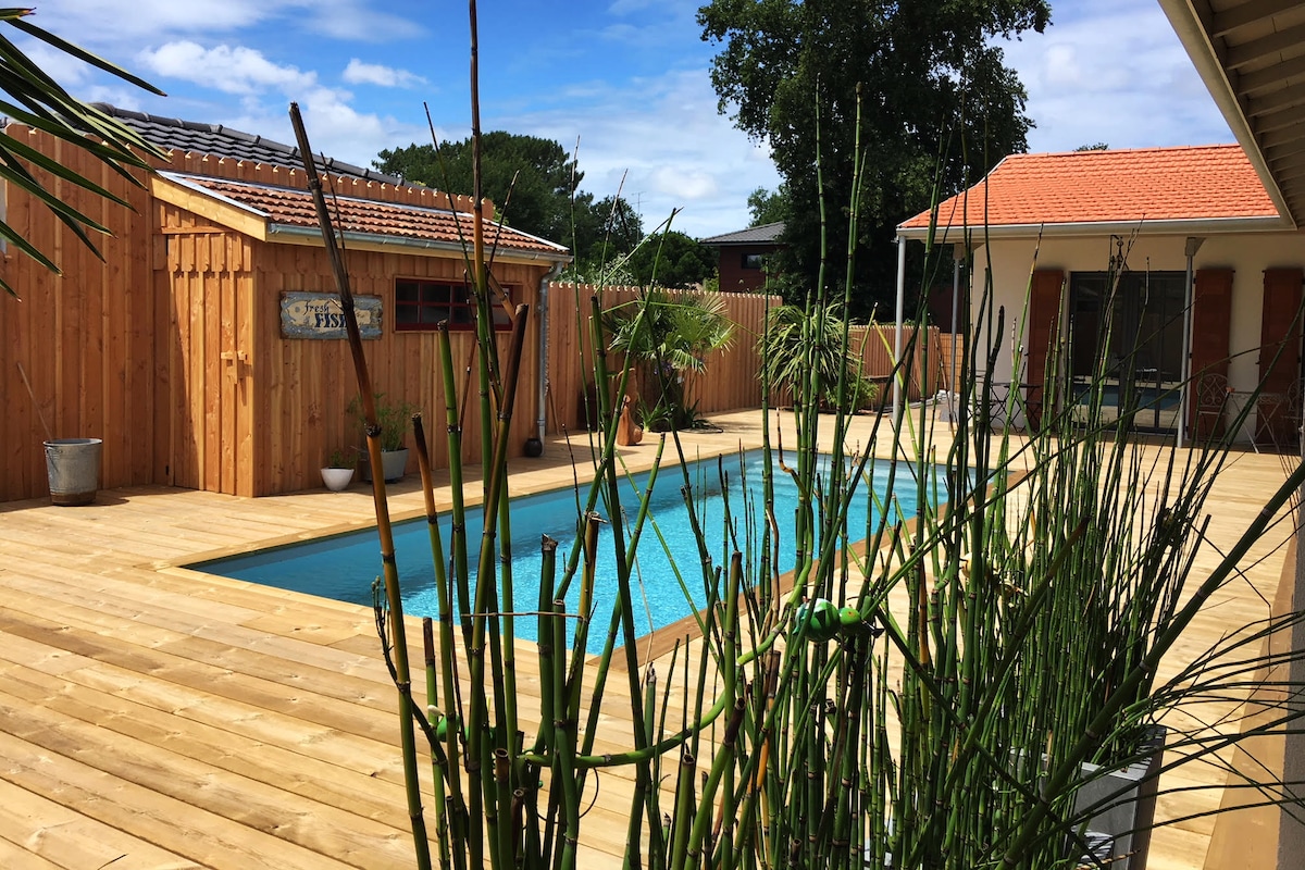 Venez et détendez vous ! Notre jolie maison de 2023, dans un quartier très calme à l'orée des bois, vous ouvre les bras pour un séjour de détente autour de la piscine . Sans vis à vis, vous n'aurez pour voisins que les chevreuils de la forêt attenante. Située dans une impasse privée , les promenades au milieu des pins sont au départ de la maison . Tout le linge de maison est inclus , voyagez léger !