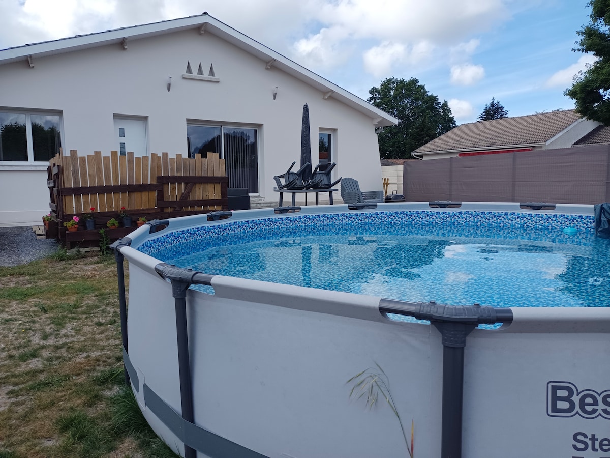 Cocon de climatisé situé, à 25 minutes à pied du lac sud et du centre-ville. Chambre cosy, lit 160x200 et salle d’eau ouverte avec grande douche WC indépendant Séjour chaleureux avec cheminée à l’éthanol, TV & Wifi Cuisine ouverte & équipée : four, micro-ondes, lave-vaisselle... Balcon à l’étage avec banquette & table Terrasse au rez-de-chaussée Maison divisée en 2 locations Piste cyclable à 900m et sentiers de randonnée devant En supplément espace bien-être " Ô spa des lacs sur place