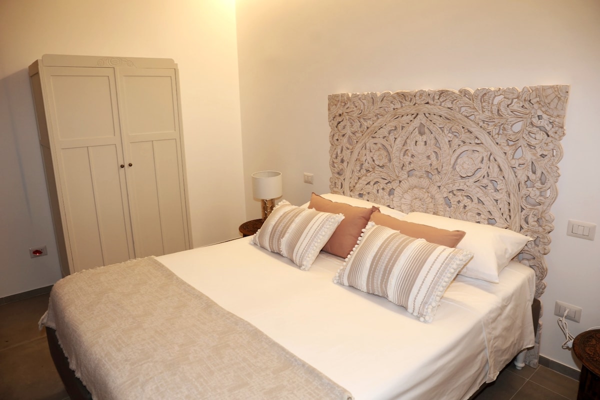 La nostra camera è in stile etnico con un letto matrimoniale in legno naturale così come i comodini, abat jour artigianali e dettagli di arredamento in stile floreale. Angolo per prima colazione con macchina per il caffè in camera. L'alloggio è provvisto di bagno in camera e balcone esclusivo privato da cui si accede attraverso porta-finestra doppia camera per un ottimo isolamento acustico e termico.