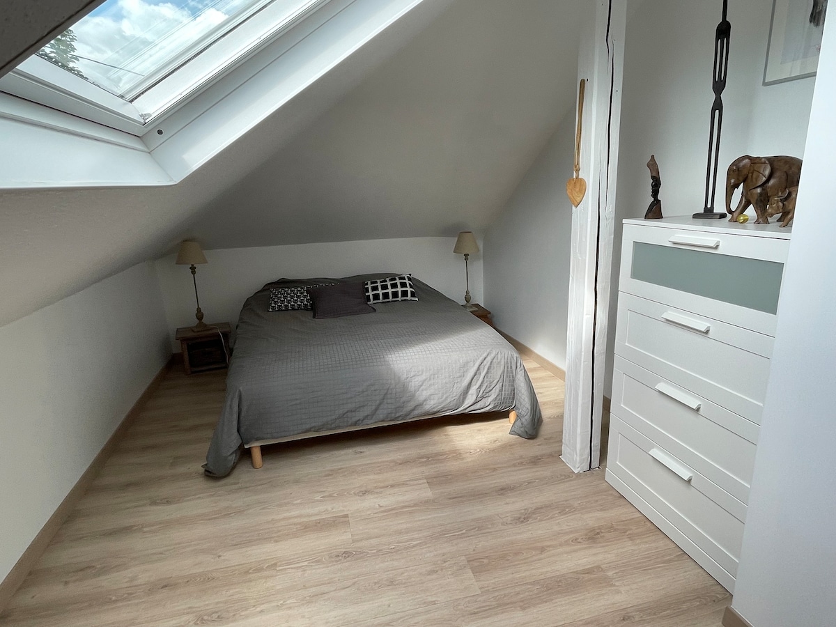 Le logement est situé dans la cour de ma propriété. À 15 minutes de Strasbourg en voiture. Le salon du rez-de-chaussée est agréable et frais en été. Dès les premiers frimas un poêle à granulés réchauffe de manière conviviale cet endroit où (dit-on) l'on se sent bien. À l'étage ('escalier en colimaçon) vous trouverez une grande suite parentale, un coin lavabo une douche ainsi qu'une petite chambre avec lit une place et 1 lit enfant (jusqu ‘à 6 ans).
