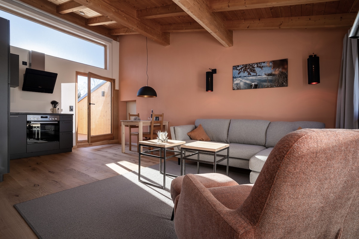 Auf Augenhöhe. Mit dem Wald. Einem Waldloft gleich, besticht unser Junior-Chalet auf 56 Quadratmetern. Erhaben. Und hoch über den Dingen. Warme, erdige, zurückhaltende Pastelltöne bestimmen das Interior-Design. Lichtdurchflutete Räume lassen die Seele baumeln. Regionales Eschenholz gestaltet den Raum. Um der Mythologie folgend Himmel und Erde zu verbinden. Für das vollendete Wohlsein sorgen eine freistehende Badewanne. Und eine eigene Sauna auf der Dachterrasse in Richtung Süden.
