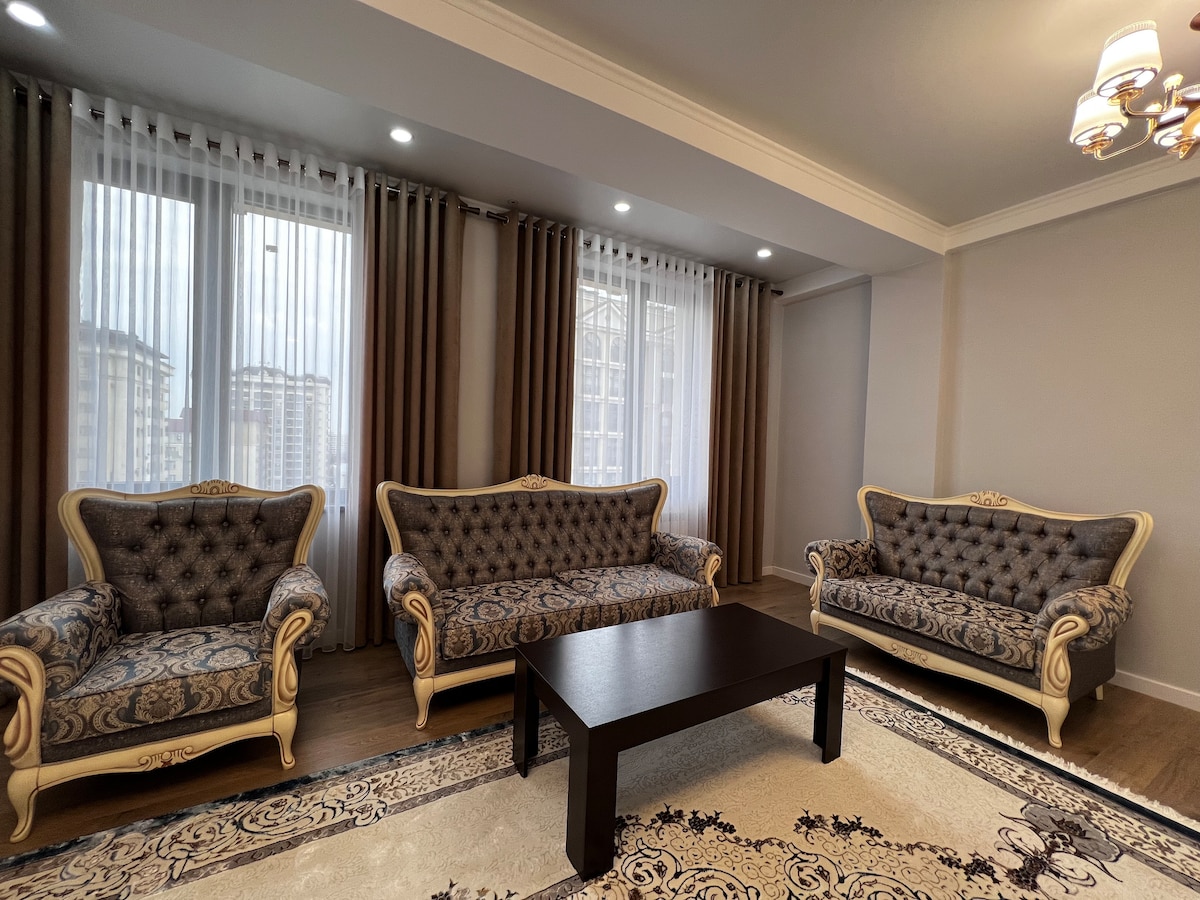 Bright and cozy modern apartment in the center of Bishkek, located in a quiet green courtyard. Fresh renovation, natural wooden floors, new furniture, and modern appliances create a warm home like atmosphere. One bedroom with a walk in wardrobe, living area, and fully equipped kitchen. Orthopedic mattress, fast Wi Fi, cable TV, air conditioning, and a comfortable workspace. Open balcony facing a green yard and a loggia on the opposite side. Self check in via secure lockbox. Ideal for your stay.