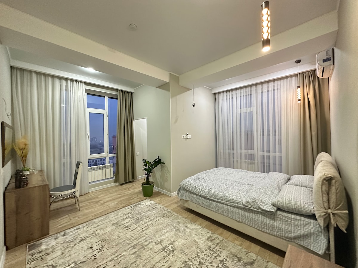 Welcome to our luxurious and spacious apartment located in the heart of Bishkek! Step into a place of comfort and convenience where every detail has been meticulously crafted to ensure an unforgettable stay. Stay connected throughout your stay with high-speed Wi-Fi. And with 24/7 security, you can rest easy knowing that your safety is our top priority. Whether you're here for business or leisure, our apartment provides the perfect home away from home.
