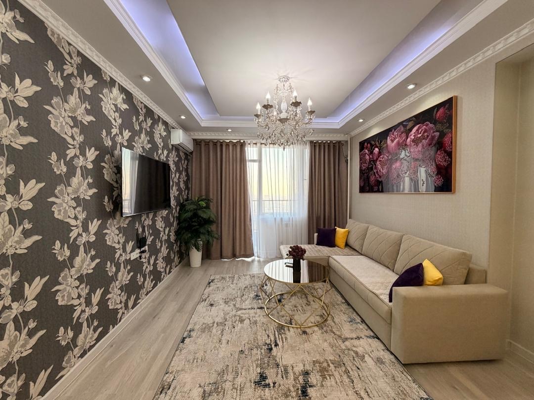 Cozy, Luxury Apartment for a comfortable stay in the freshly made Elite House located in the city center. The house is striking both day and night. At night, the building shines very beautifully, can be seen even from a long distance. On the ground floor of the building, there is a 24/7 supermarket & pharmacy, GYM, beauty salons, bank. The apartment is very bright and comfortable with all amenities. The building is safe and guarded around the clock, there is also a playground on the territory.