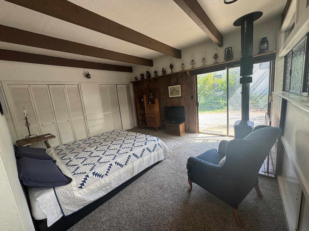 Welcome to our home! A few mins walk to Main Street, porch hammock views of parkland & the Sierras. Spacious open kitchen/living room, with wood-burning stove & large table for dining or working. 3 bedrooms with their own Smart TVs; the main has its own bathroom & entrance. Queen size sofa-bed in the living room. Dogs are welcome - doggy door & fenced in yard. Charcoal grill with table & chairs for 8. If you have vehicles to store, there's a double-garage & parking for camper or RV in the back.
