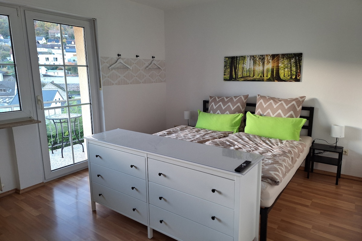 Newly renovated after storm damage! Separate small studio guesthouse behind the main house with parking , wonderful views of the Ahr valley nearby. Small en-suite wet room with shower and toilet, basic cooking area with a double cooking hob, fridge, microwave, kettle, toaster and seating area. There is a tiny patio outside with seating. 28km to the Nürburgring. 4 hiking paths are just outside the front door. Very quiet country village. Shops, bank etc in nearby Ahrbrück (4km) Pets are welcome