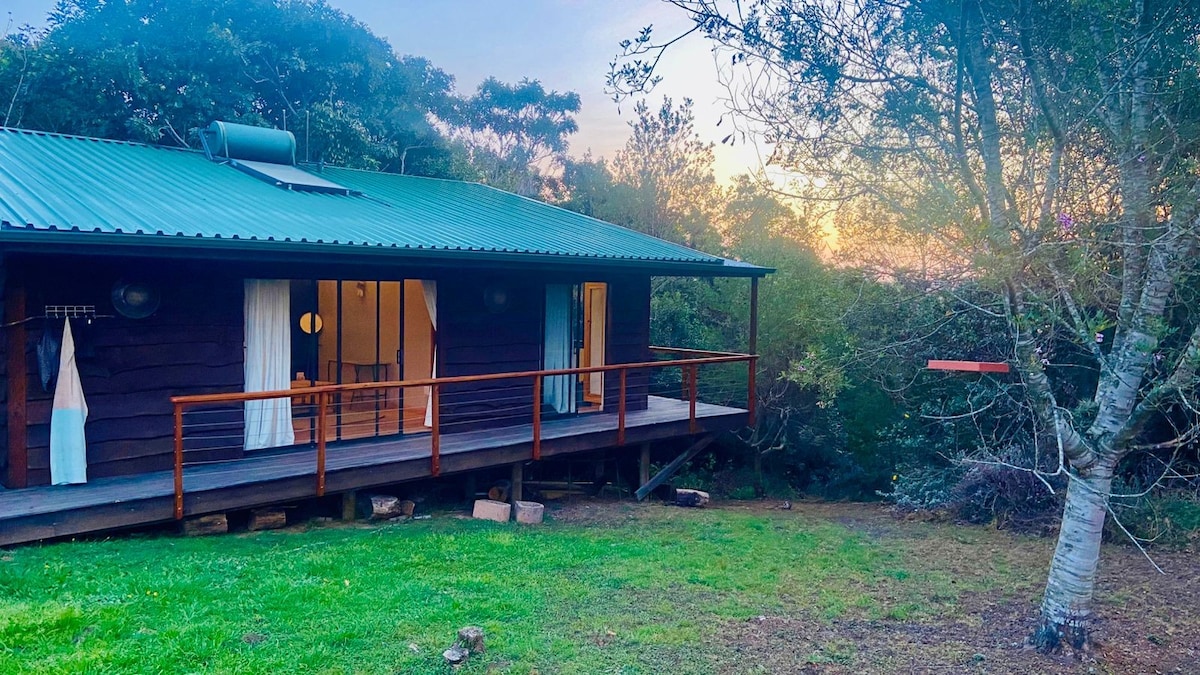 Hand-built wooden cottage nestled against Afro-montane forest with wrap-around deck and views of the Tsitsitkamma mountains. A peaceful, self-catering retreat in nature, this secluded cottage is perfect for couples or young families. It features a cozy bedroom, open-plan lounge with queen-sized sleeper couch, fully equipped kitchenette and bathroom with forest-facing shower enclosed by glass. Includes a covered outdoor dining area. Pet-friendly by prior arrangement only.