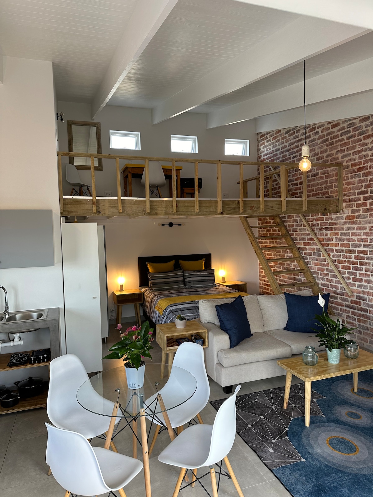 Bright loft apartment 1st floor with expansive views of Robberg Island, hear the sea in a quiet place with huge swimming pool. The beautiful beach is only 750 m distance. Covered carport. Modern 1 bedroom, 1 bathroom and 2 balconies with fantastic views to Robberg Island. Iocated in a property with 24-hour security and strong WIFI. Portable Power for Load-shedding. You can power wifi, standing lights and charge cell phones when power is off. There are work areas, ideal to do on your laptop.