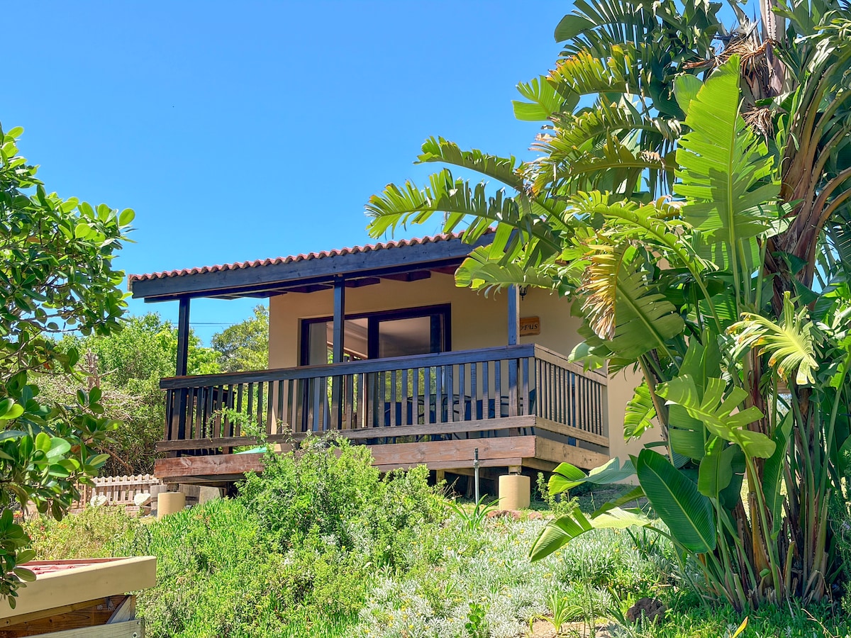 By no means on millionaires mile but situated in the heart of Plettenberg Bay, with solar power, central to all amenities, beaches, shops, restaurants and bars. Includes wi-fi, full DSTV etc. In a Sunny courtyard right next to the main house, shared outdoor space. with undercover safe parking for 1 car only and shared swimming pool. 2 bedrooms with sleeping loft, full kitchen and lounge area with patio and deck with views of the Lookout Bay and Lagoon.