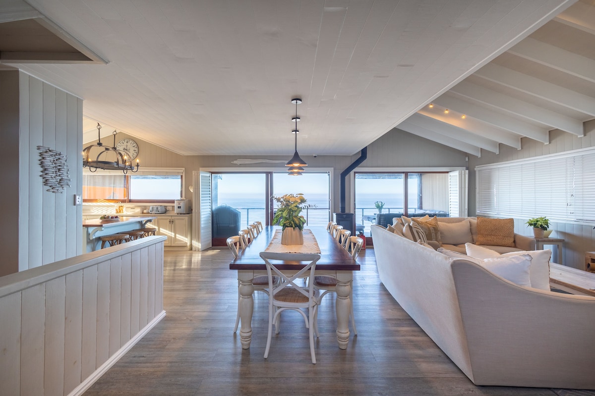 This serene beach house blends coastal charm with modern comfort, offering breathtaking ocean views from its open-plan living space. Warm wooden floors, vaulted ceilings, and large glass doors invite natural light and sea breezes. A rustic dining table, cozy kitchen, and plush sofas create a welcoming atmosphere. Perfect for morning coffee or sunset relaxation, this tranquil retreat is your sanctuary by the sea.