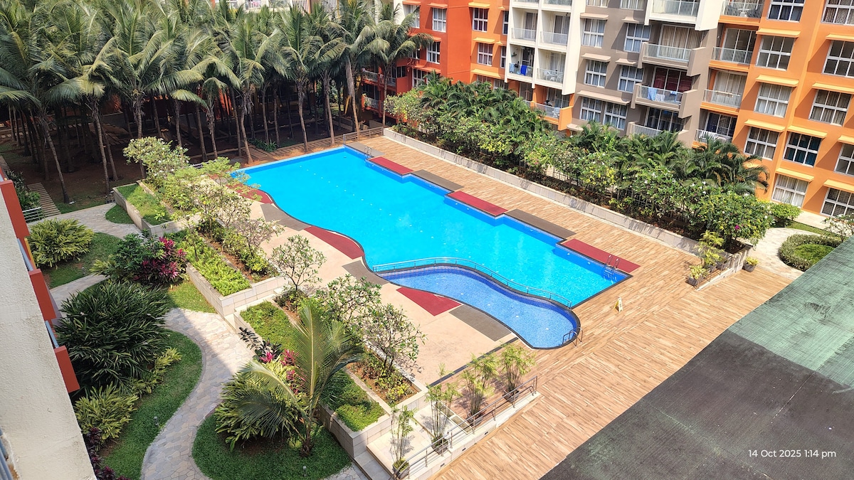 🏡 Away from the city & located 4 km from the airport, our RESORT-STYLE home is away from the crowd. Hello Red-Eye flights! It’s 15-20 minute drive from Bogmalo beach, one of the pristine beaches of South Goa known for peace, great food & beach wear shopping. Several cafés, pizzerias & restaurants serving authentic Goan cuisine dot the neighbourhood. The apartment itself boasts of a resort lifestyle with free amenities for our guests-covered parking, choice of swimming pool, sno