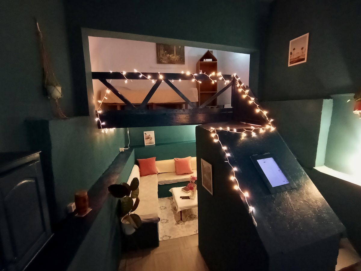 Charmant mini studio avec mezzanine – cœur de Bizerte Découvrez ce joli mini studio entièrement climatisé, décoré avec goût dans un style chaleureux et moderne. Idéalement situé en plein centre-ville de Bizerte, à proximité immédiate des commerces, cafés, restaurants et du vieux port. Parfait pour un séjour en solo ou en couple, que ce soit pour quelques jours ou pour une plus longue durée. Le charme du centre-ville de Bizerte à votre porte !