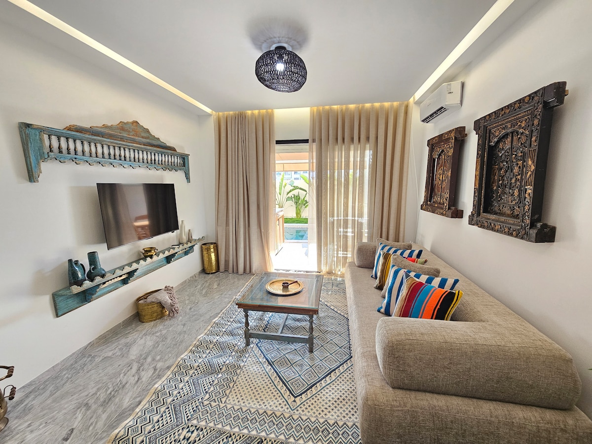 Rez de chaussée autonome dans une demeure avec quatre terrasses, grand jardin, piscine privés . Vous adorerez le décor en bois style balinais. Un 150 m² éclairé par des grandes bais vitrées, avec un grand salon, 2 chambres à coucher dotée chacune de sa propre salle de bain, Hammam, cuisine richement équipée, et espace bureau. Services inclus : - Café, sucre, eau à l'arrivée - Linge, draps, shampooing Services optionnels : - Navette Aéroport - Petit-déjeuner, cuisine TN - Hammam 30 euros
