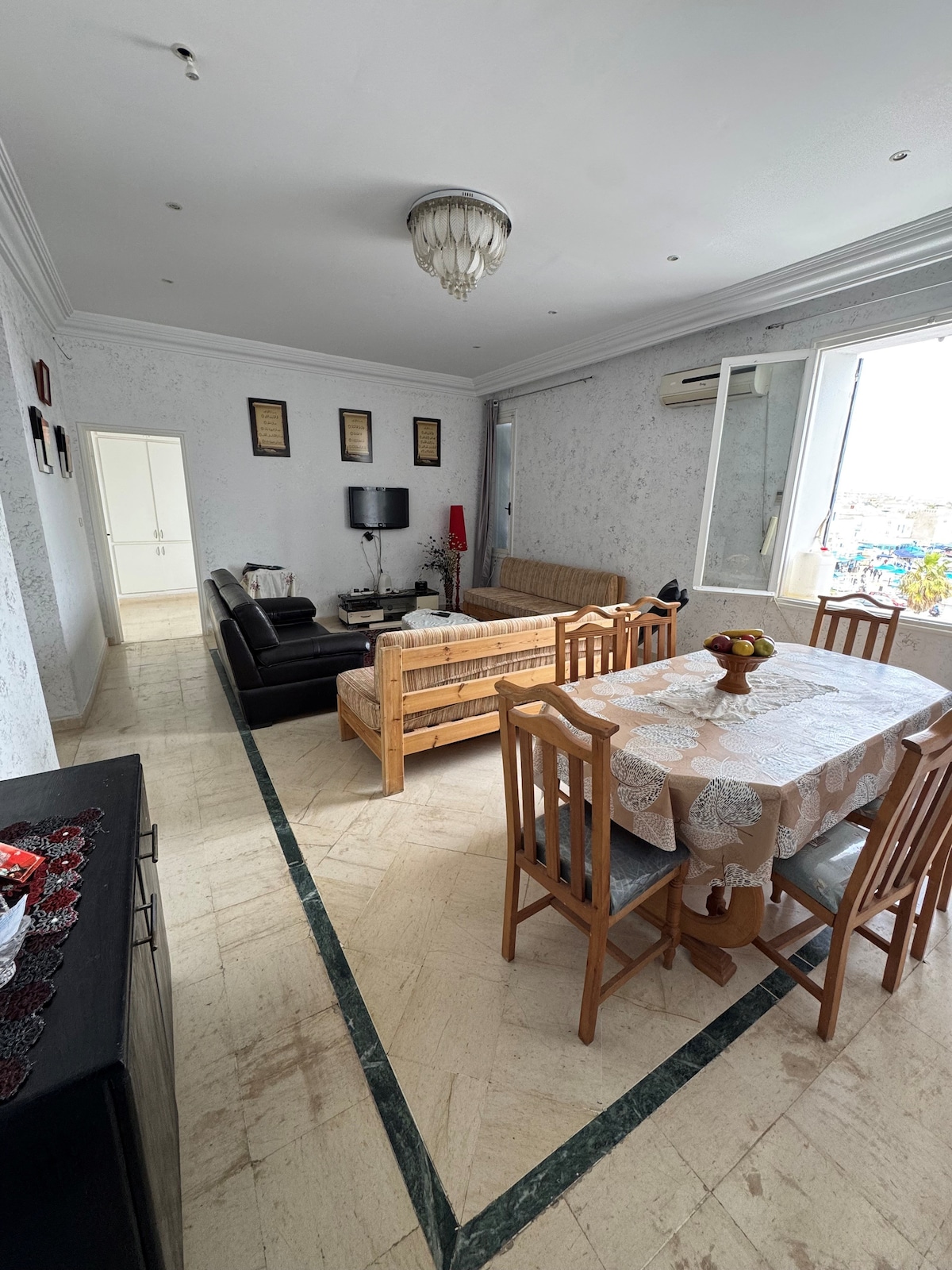 An ocean view Apartment , centrally-located place. Walking distance from downtown, old Madina , Corniche bizerte , private beach, pool , Day and night entertainment, 4 star restaurant, and coffee shop , night time life band , kids and family friendly , and the most important highly secure and safe. You will stay in private apartment that can fit up to 5 people, 1 Room with Double bad and a living Room with 3 BiG sofa bad each Room has a private AC control Spacious, , AC , Free WIFI,….