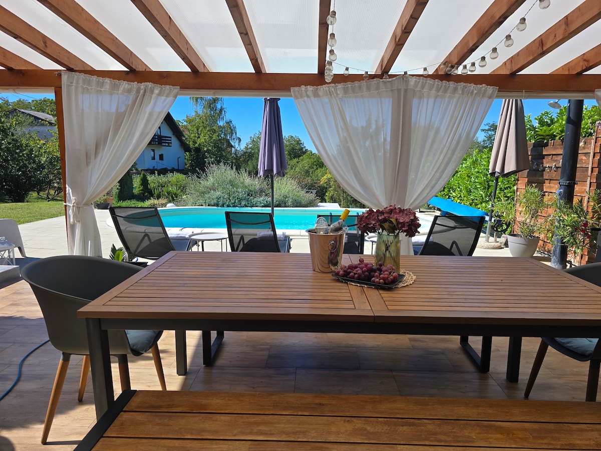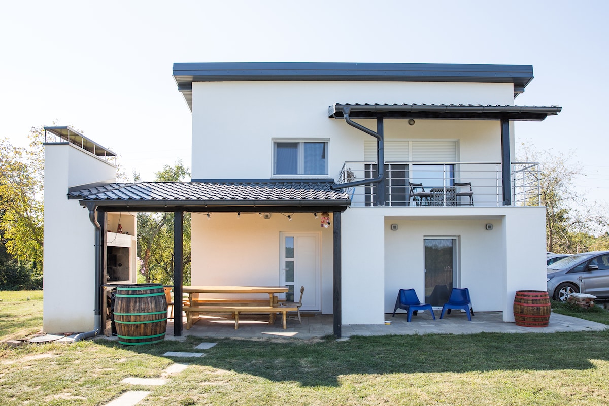 Kuća se nalazi u prirodi okružena vinogradima i šumom . U dvorištu se nalazi bazen i veliko dječje igralište. Idealno za odmor i bijeg u prirodu.