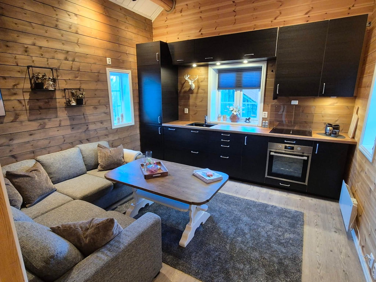 Lys og moderne hytte. Nyoppført i 2018. Spotter i tak, kjøleskap, oppvaskmaskin, komfyr og stekeplater. Spisebord med plass til 6 stk. Kabel-tv og sofa. Flislagt bad med regnfallsdusj. 2 soverom med dobbeltseng pluss hems med plass til 2-3 stk. Utsikt mot fjell og hav. Terrasse med utemøbler og grill.