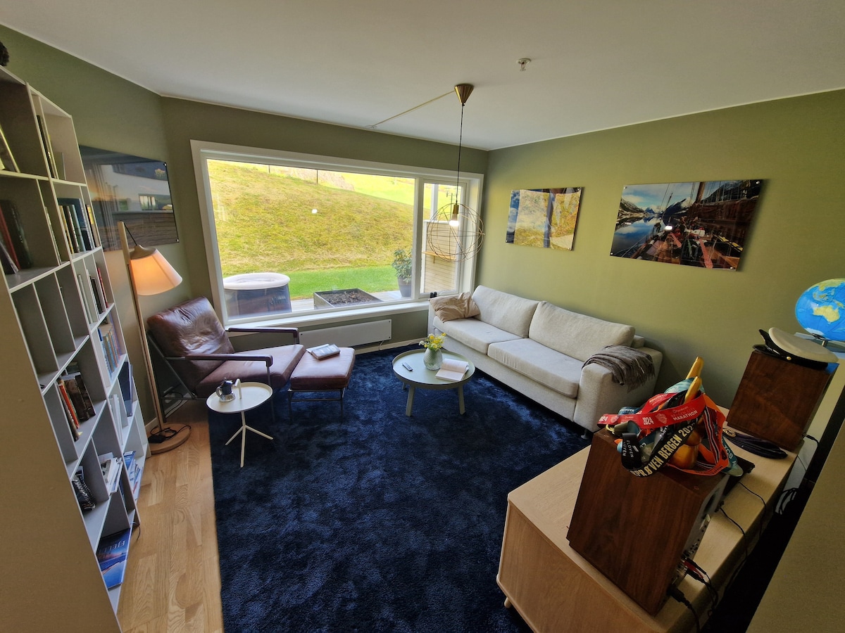 Great apartment of 60 m2. It is 15 minutes to downtown Bergen and 10 minutes to the airport by car. Good bus connections to the city center, 800 meters away. You can definitely get around by public transport, however, a rental car will normally be preferable. The apartment has a living room with a double sofabed, kitchen, 2 bedrooms with double beds, bathroom, private entrance, parking lot and a private terrace with a fantastic sea view and evening sun.
