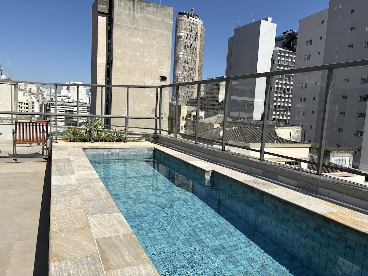 Concept studio, new with a view and an integrated floor plan (overlooking Praça da República). Fully equipped kitchen. Wi-Fi, air conditioning, and a 40 -inch Smart TV. An ideal space for those coming to São Paulo for both work and leisure. Game room, coworking space, shared laundry with dryer, gym, swimming pool, and a lookout with a panoramic view of the city center. Close to São Paulo's tourist and historical attractions, concert venues, famous bars, and restaurants.