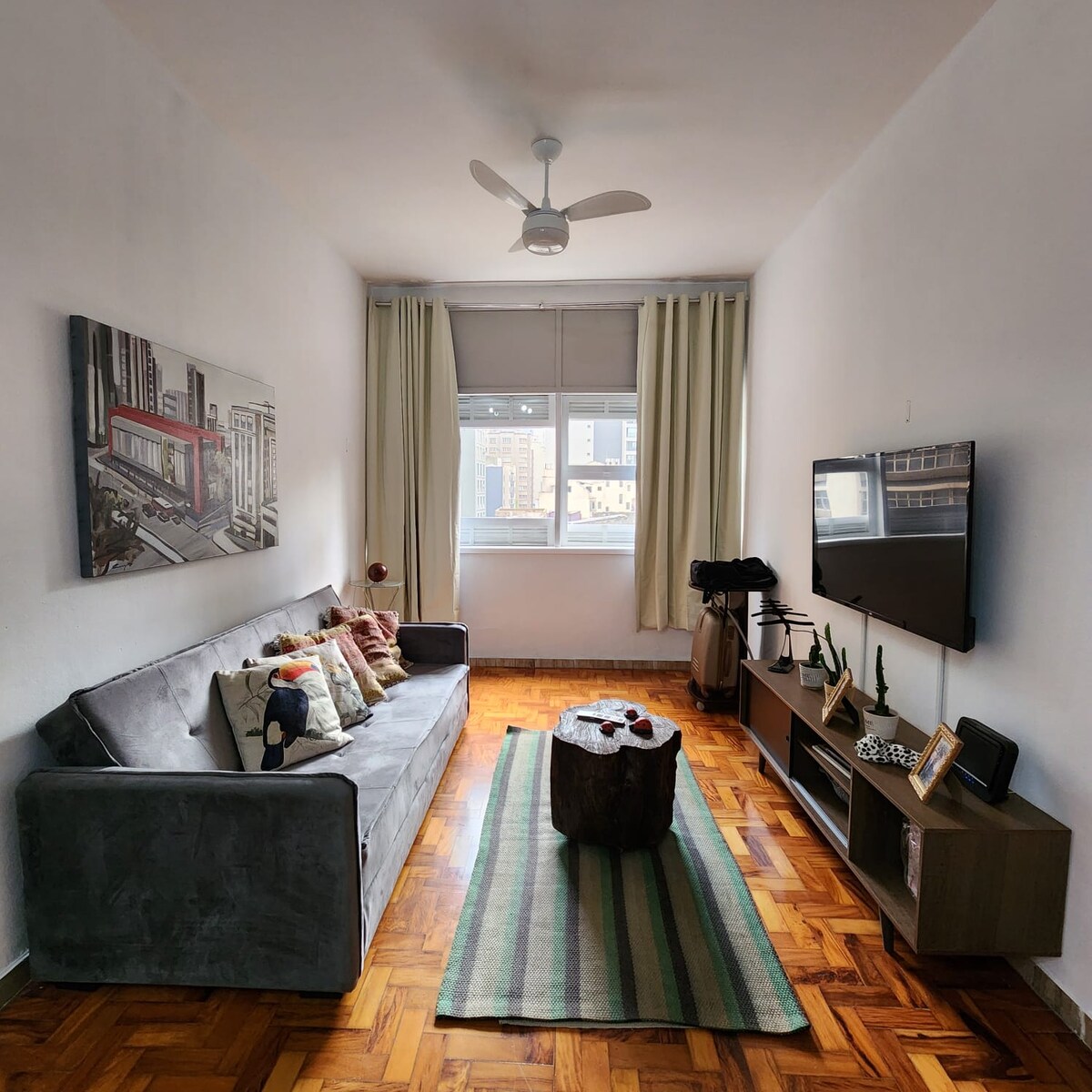 Apartamento novo, totalmente mobiliado e equipado com tudo sem uso e de muito bom gosto.Fica no centro de São Paulo ao lado da estação república do metrô, ao lado do ponto de ônibus que serve o aeroporto de Cumbica. Cama box de casal , sofá cama, micro ondas, cafeteira, forninho elétrico, grill, smart tv de 49' uk , ar condicionado, geladeira, panela de pressão, mesa na varanda, talheres, pratos , copos , ducha higiênica, secador de cabelos ,wi fi . Linda vista para a praça da república.