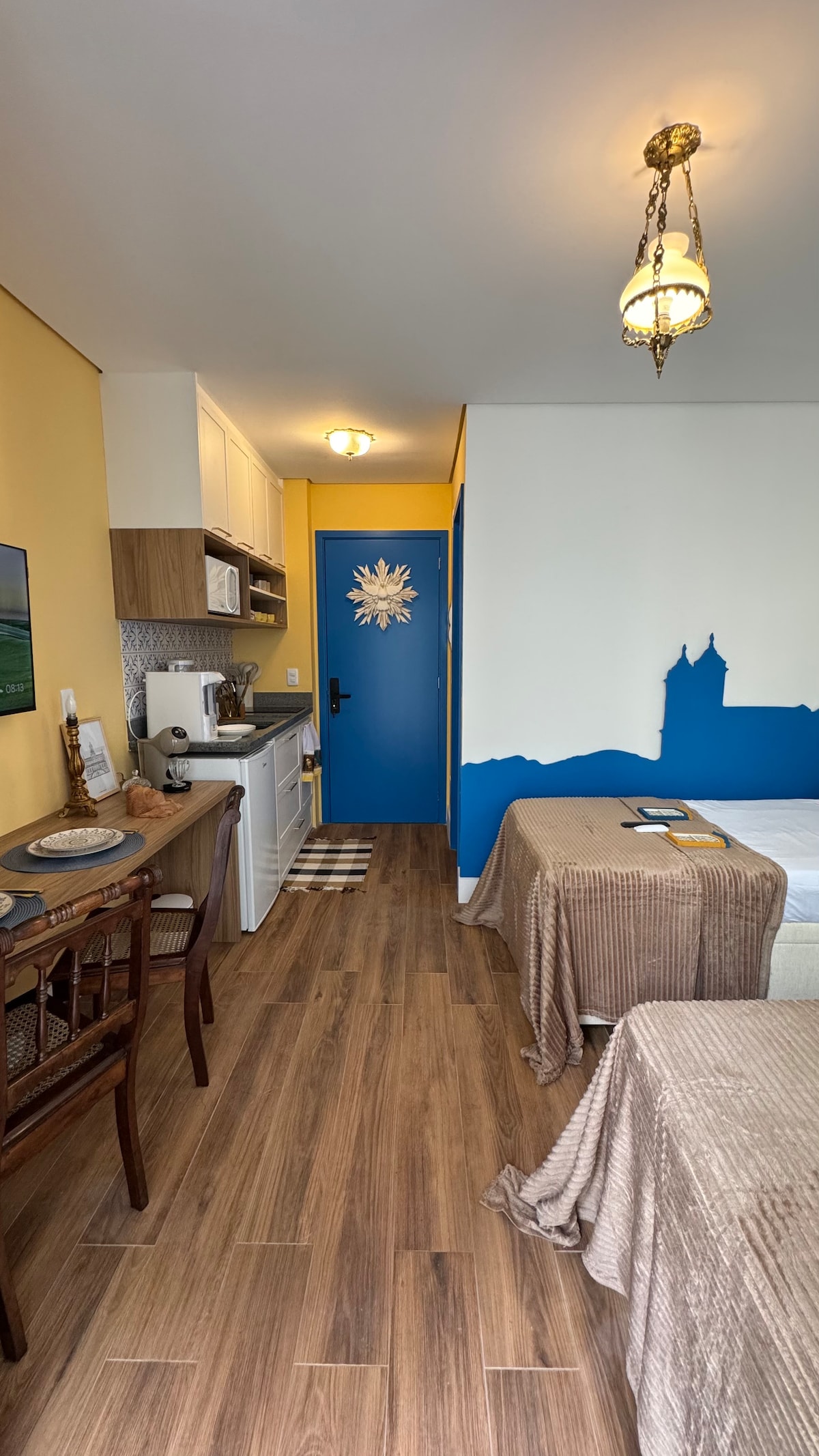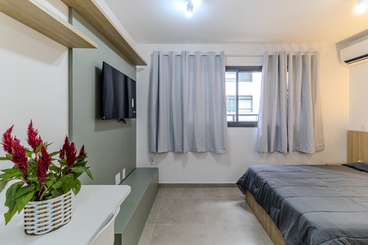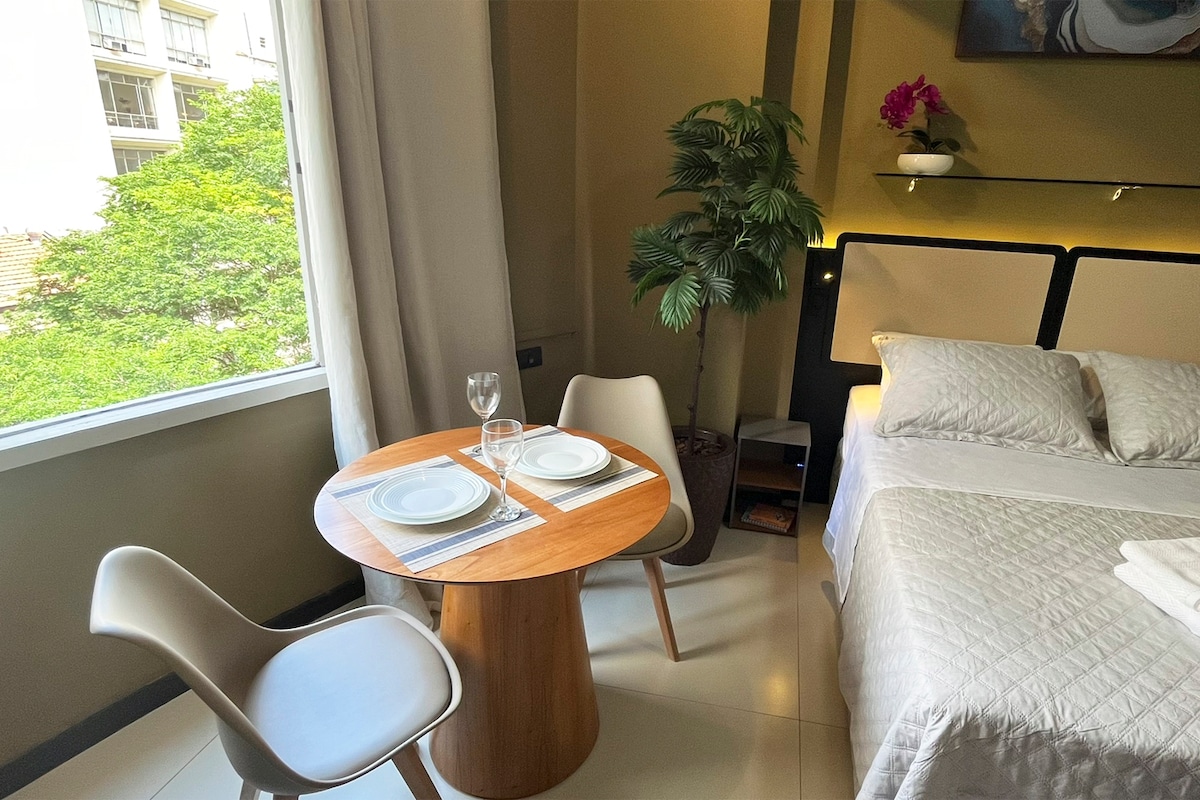 Studio prático, confortável e estiloso. Localizado no centro de São Paulo, rodeado de restaurantes premiados e de ampla opção de transporte. Possui tudo que é necessário para uma curta ou longa estadia. Com uma vista sensacional da cidade e do pôr do sol, conta com ar condicionado com ion care, smart tv, microondas, geladeira duplex, fogão e caixa de som. Estacionamento seguro e coberto dentro do edifício, piscina e academia.