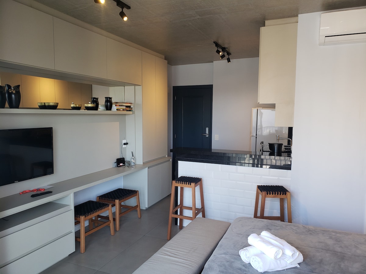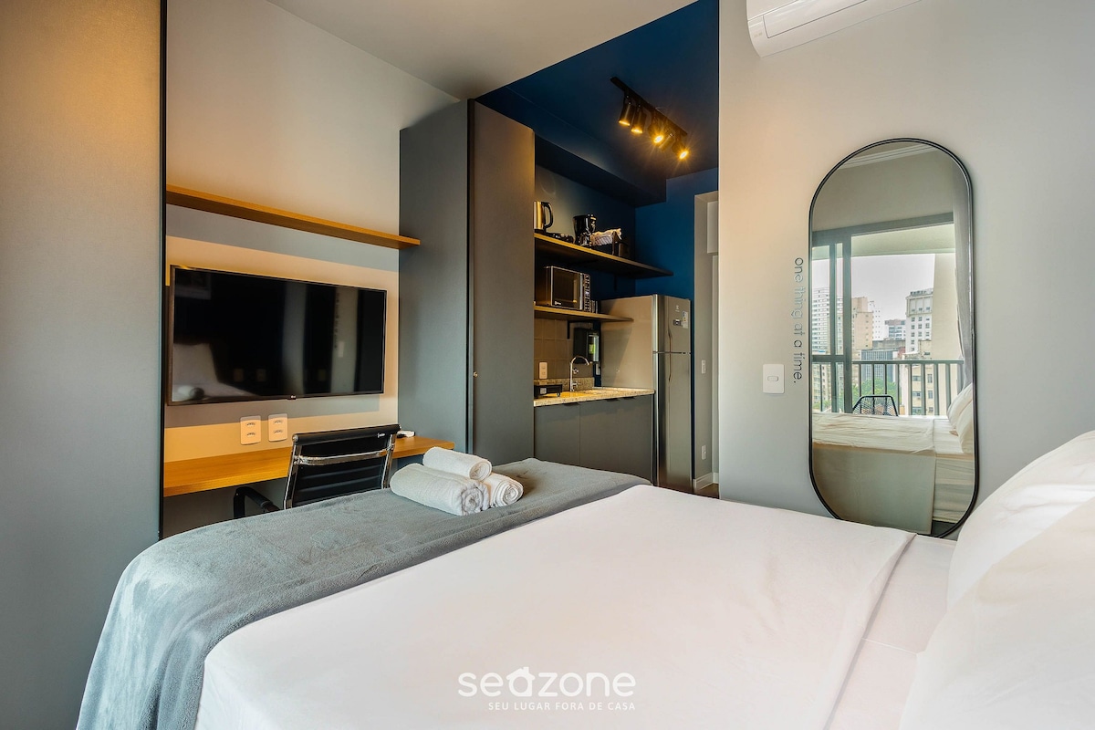 Concept studio, new with a view and an integrated floor plan (overlooking Praça da República). Fully equipped kitchen. Wi-Fi, air conditioning, and a 40 -inch Smart TV. An ideal space for those coming to São Paulo for both work and leisure. Game room, coworking space, shared laundry with dryer, gym, swimming pool, and a lookout with a panoramic view of the city center. Close to São Paulo's tourist and historical attractions, concert venues, famous bars, and restaurants.