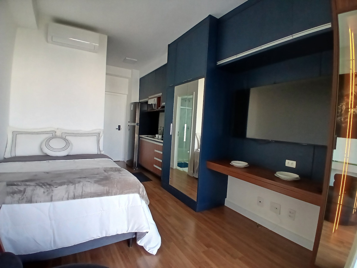 Experience São Paulo with comfort, security and style 32m² modern studio, fully equipped and newly renovated with industrial design, warm lighting and all the technology you need to relax or work comfortably. Prime location: 700m from Higienópolis-Mackenzie subway, surrounded by great restaurants, bars and markets within two blocks. Safe and quiet building with 24/7 concierge, next to a police post and facing a green area — a rare find in São Paulo. Excellent value in Higienópolis!