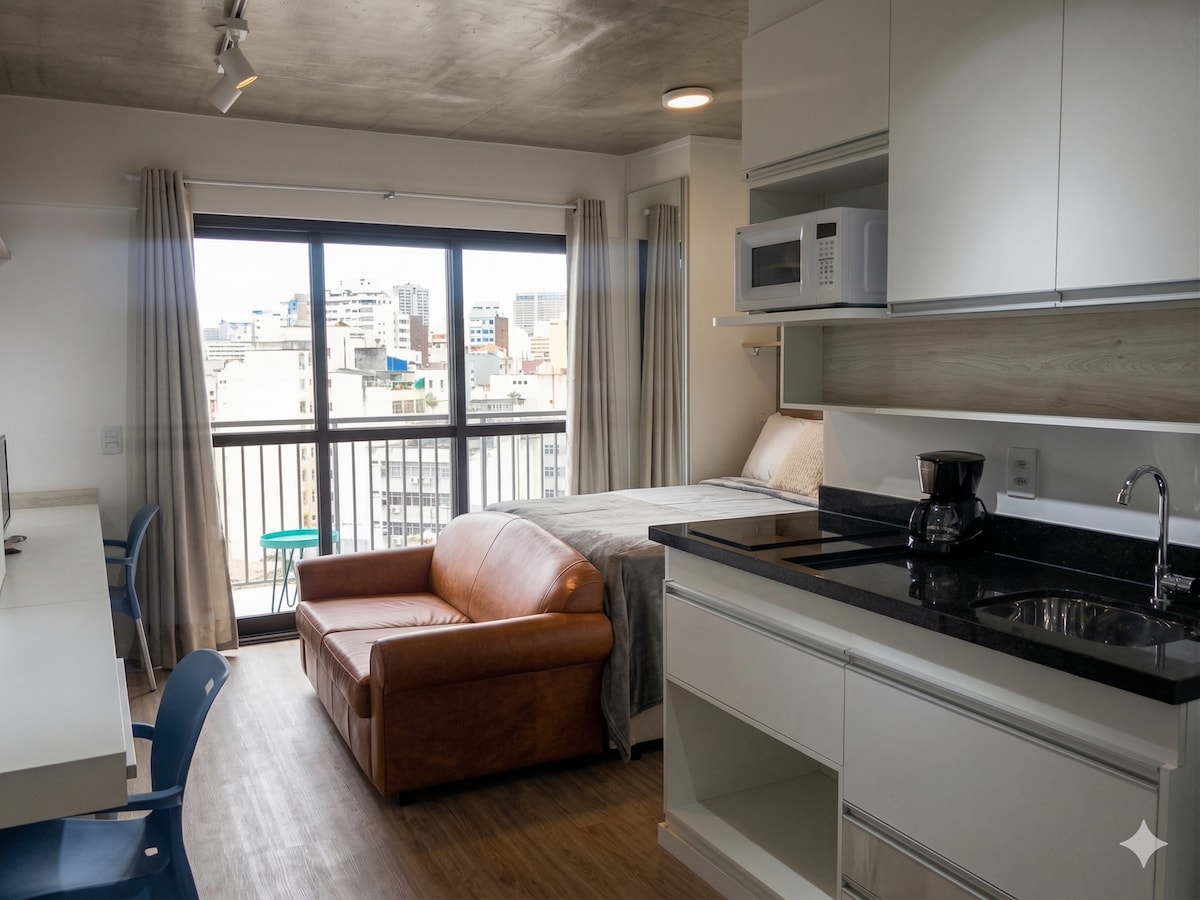Cozy and comfortable studio, equipped and new. Excellent quality Internet. 24 hs concierge. 24 hs parking nearby. Availability of public transport, metro, bus and train terminals, easy access by car. Ideal for short and long stays. Located meters from the Copan Building, Roosevelt Square, Municipal Theater. In the region there are many options for restaurants, bars, universities, hospitals, theaters. Rich cultural and diversity area.
