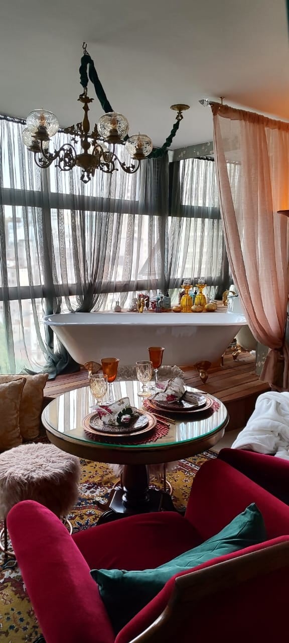 Um exuberante loft temático, assinado pela designer de interiores "Josepha Borges" Foi pensado para te transportar para 1920, foi inspirado na serie As Telefonistas, com o proposito da época dourada, com muita requinte e sofisticação da época, com um grande diferencial, uma banheira vitoriana para dois, a vista única para contemplar a vida moderna fluindo no centro histórico de são Paulo.