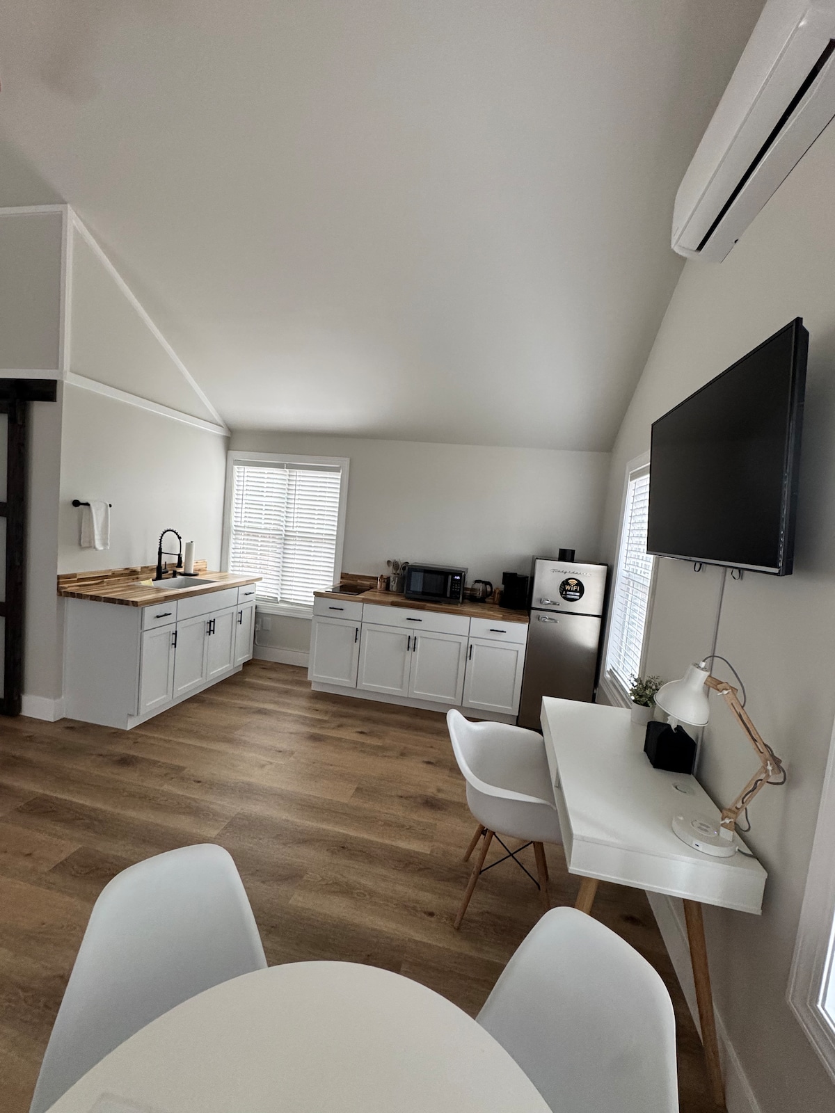 Updated efficiency pool house apartment at the Scarborough House in rural Stantonsburg. ~20 min from I-95, restaurants, shopping areas in Wilson, 25 min to Greenville, 30 min to Rocky Mount. House is inside the pool area - not suitable for families with small children or anyone who cannot swim as this house is inside the pool gate. Space has a kitchen with full fridge, countertop air fryer, microwave, single coffee maker. Huge shower room and bathroom. (SHARED POOL)