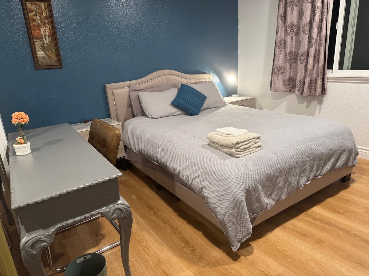 Located at the far end of the house. This beautiful private room offers some separation from the activity of the kitchen and facilities. An oasis, located in the heart of the city. Features • Hotel Inspired King Bed • Private bar height Dining Table/ Leather chairs • Work desk • 50 in Wall mounted TV w. Netflix, Amazon, & Roku • AC & 2 Large Ceiling Fans • Private Fridge and Microwave • Free Laundry Popular Places • Disneyland & Anaheim Conv Cntr 10 mi • Angel’s Stdm and Honda Ctr 9 mi
