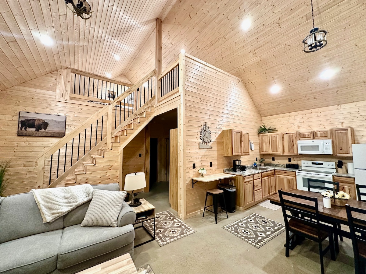 Sunrise Ridge w/ spacious outdoor area. Private entrance, parking, & patio area! Apartment is below main house; ground level, no stairs. Modern-rustic accents, remodeled stylish bathroom/kitchen with full amenities for baking/cooking. Wifi & Roku with free access to Netflix, Disney +, Max on big screen TV. One bedroom: King bed with twin size bunk bed; full size futon in living room. 4-7 day stay discount. No cleaning fee! See pictures & description-perhaps the right fit for your group!