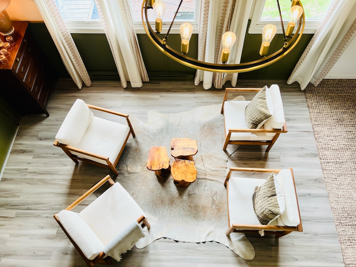 Nestled at the edge of a forest and named after our resident owl, Hooting Haus is a European styled cabin retreat close to all Penn State offers. The gourmet kitchen's rustic charm features a zinc island, butcher block counter and stunning natural stone wall. Entertain guests at the artisan crafted pine table while dining next to the antique cast iron fireplace. Cap the evening sharing stories under the cool night sky gathered 'round the fire pit with a soothing hot toddy or mug of creamy cocoa.
