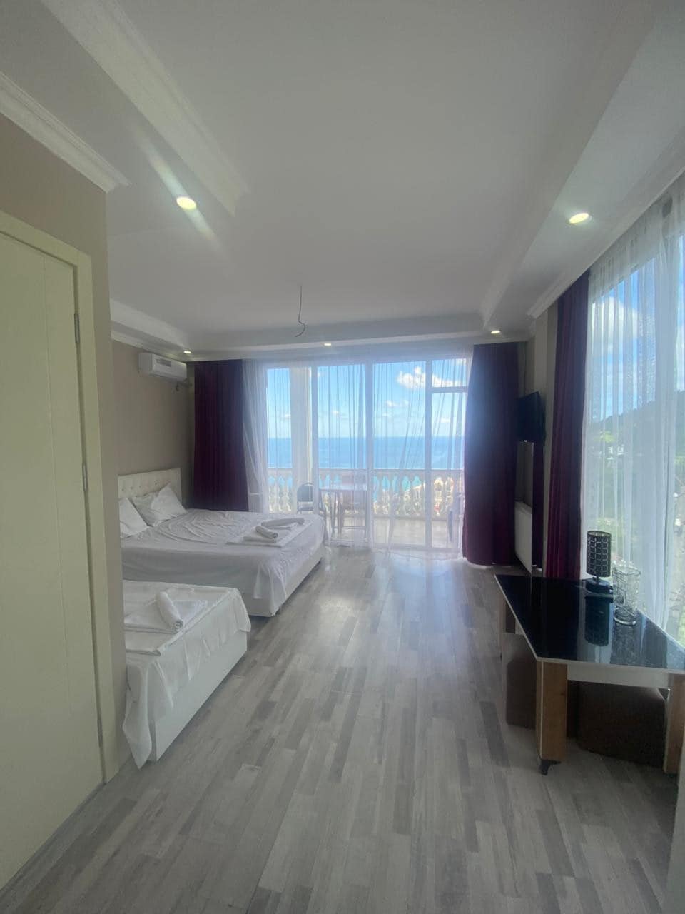Прекрасный дом,недалеко от моря, всего в 250 метрах! На небольшом взгорье, с чудесным видом на море и постоянным свежим морским бризом. В вашем распоряжении весь второй этаж с отдельным входом,тремя спальнями, огромным залом,кухней санузлом и балконом. С каждой спальни открывается панорамный вид на море. Во всех спальнях по две удобные кровати, с возможностью добавить еще по одной кровати. + в зале уголок раскладывается и превращается в кровать для двоих! и смарт телевизор с плоским экраном.