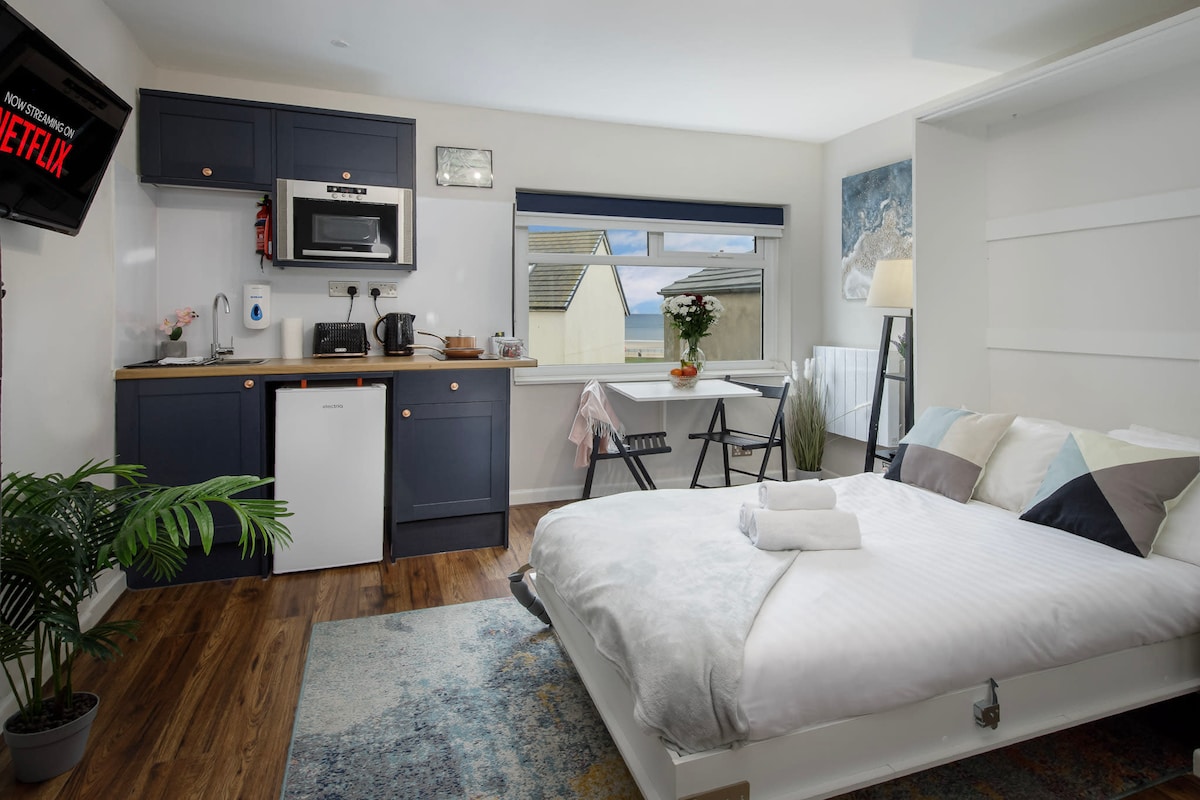 Enjoy a luxury stay in this stunning brand new seafront apartment. This is a unique property with a large balcony to enjoy the sea view. We have 1 bedroom with a super king bed and a single pull out bed perfect for children of any age. Very spacious, and room for a travel cot if needed. The lounge open plan kitchen lounge features a double sofa bed, large smart tv and fully equipped kitchen. Floor to ceiling sliding doors to enjoy the view and a very large balcony. This is a brand new property.