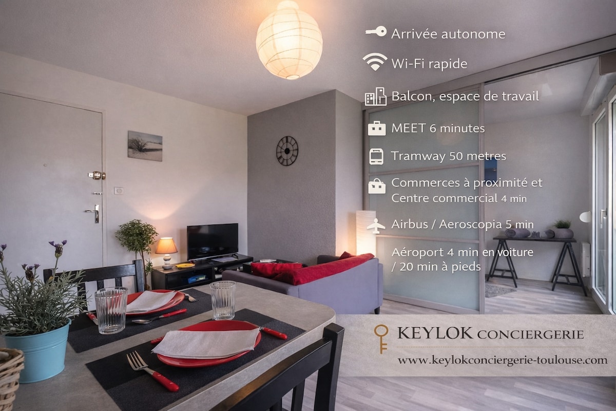 Escale à Toulouse, exposant ou visiteur du MEET, voyage professionnel, spectacle à Odyssud, Aéroscopia… Cet appartement vous offrira un cadre reposant pour vos fins de journées. Idéalement situé. Vous pourrez laisser votre voiture sur le parking privatif sécurisé et prendre le tramway au pied de la résidence, ligne Toulouse centre - Aéroport - MEET. Vous serez à 5mn à pied des restaurants du centre-ville blagnacais. Pour les sportifs, le parc d'Odyssud ou celui des Ramiers sont à proximité.