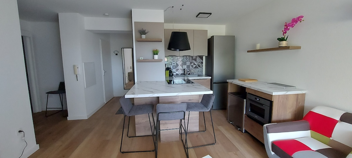 Bienvenue dans notre magnifique logement entièrement refait à neuf, situé à Blagnac. Vous apprécierez cet appartement en rez-de-jardin pour son confort, sa cuisine équipée, sa climatisation l'été, sa terrasse cozy, ses deux chambres avec placard et sa position géographique. Proche de l'aéroport, du MEET, de Airbus et de Toulouse, accès voie rapide à 5 min. Petit immeuble calme, proche de toutes commodités, tramway à 5min à pied. Il y a une place de parking avec le logement.