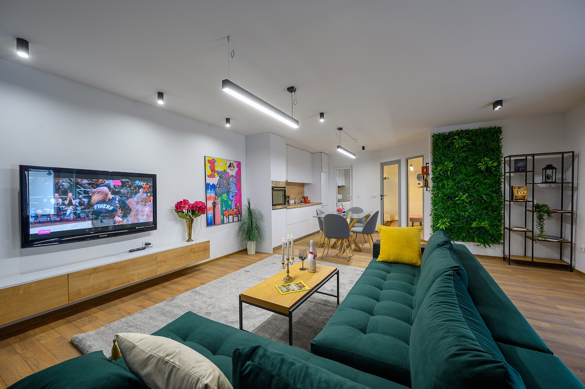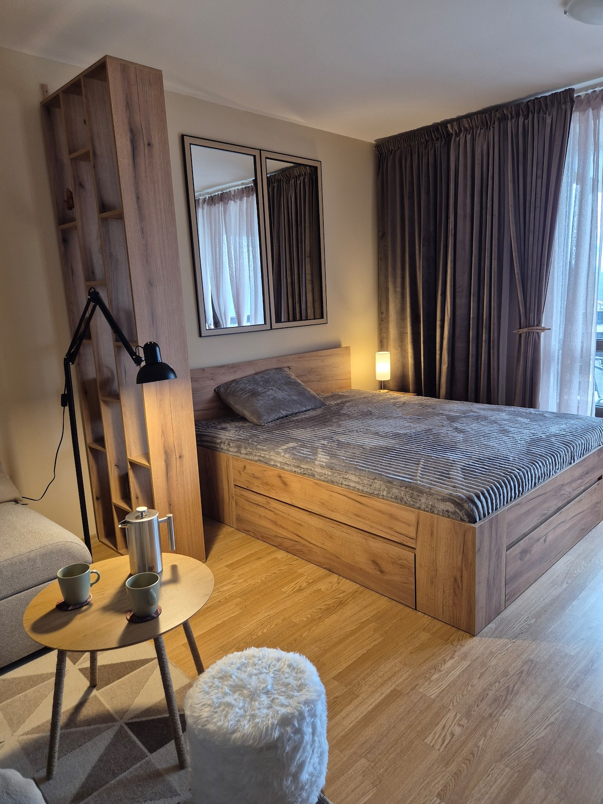 Enjoy a stylish experience at this centrally-located place, situated only meters away from the best restaurant and shopping scene and only a few hundred meters away from the American University in Bulgaria campus. It has all necessary facilities for a productive working environment or a relaxed get away. Situated in a new building with a lift, the apartment offers high speed internet, comfortable bed, stylish setting, washer & dryer and large terrace overlooking the Rila hills.