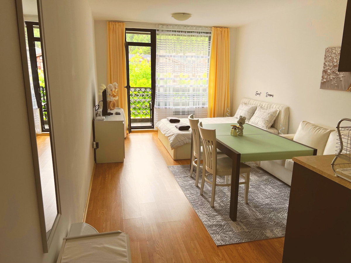 Създадохме този дом с много любов и старание! Тишина и спокойствие! Намира се точно срещу входа на СПА центъра на комплекса. В студиото има всичко необходимо за да се чувствате като у дома си: Smart TV 50", електрическа камина, пералня, хладилник с мини фризер, микровълнова печка, кафе-машина, вана... Възможност за безплатно паркиране пред входа или на паркинга на СПА комплекса.