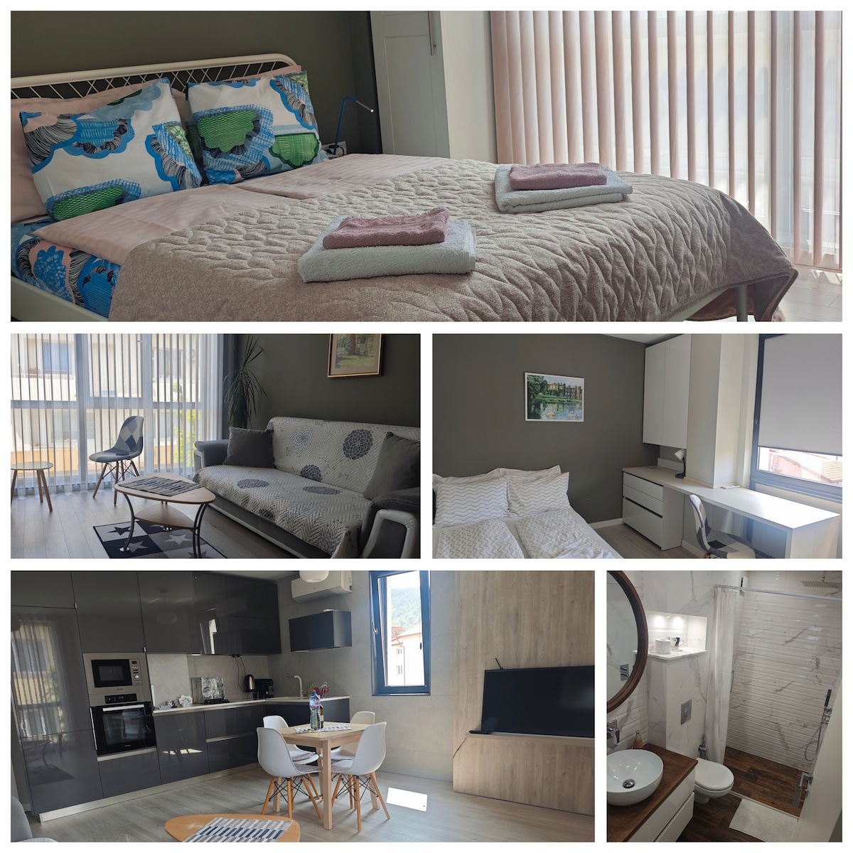 Modern apartment in a new building just 50m from downtown and a 5-minute walk to AUBG. Fully furnished with a double sofa bed, equipped kitchen, bathroom with shower, fast Wi-Fi, and air conditioning. The location is perfect for easy access to restaurants, shops, and city attractions. A private parking space is available upon request, offering a convenient solution for guests traveling by car. Flexible check-in, fresh sheets and towels included, plus 24/7 support during your stay.