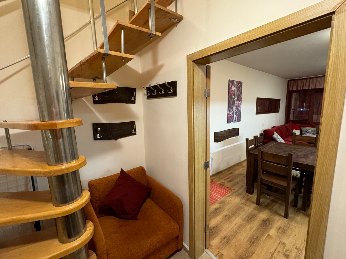 Enjoy this modern-designed one-bedroom apartment on two levels in a beautiful complex with an amazing view. The alpine interior design will bring you a warm feeling after a day in the mountains.. The complex itself is situated in a beautiful mountain area at the foot of the Pirin mountain, in the southern part of Bansko resort, east of the ski slopes. WiFi connection covers the entire property.