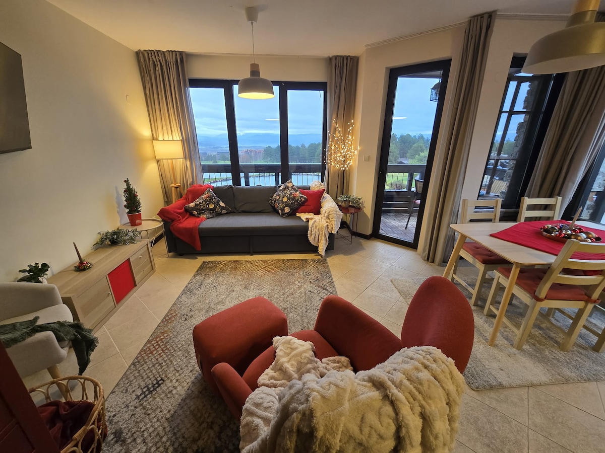The apartment is located just minutes from the largest Bulgarian ski resort - Bansko, in the "Pirin Golf § Country Club”.The cozy atmosphere of the apartment, the beautiful view of the mountains and the fresh air will make your stay unforgettable.The apartment has one bedroom with TV, bathroom and toilet, living room with sofa bed, TV, equipped kitchen! The spa zone is payed additionally.