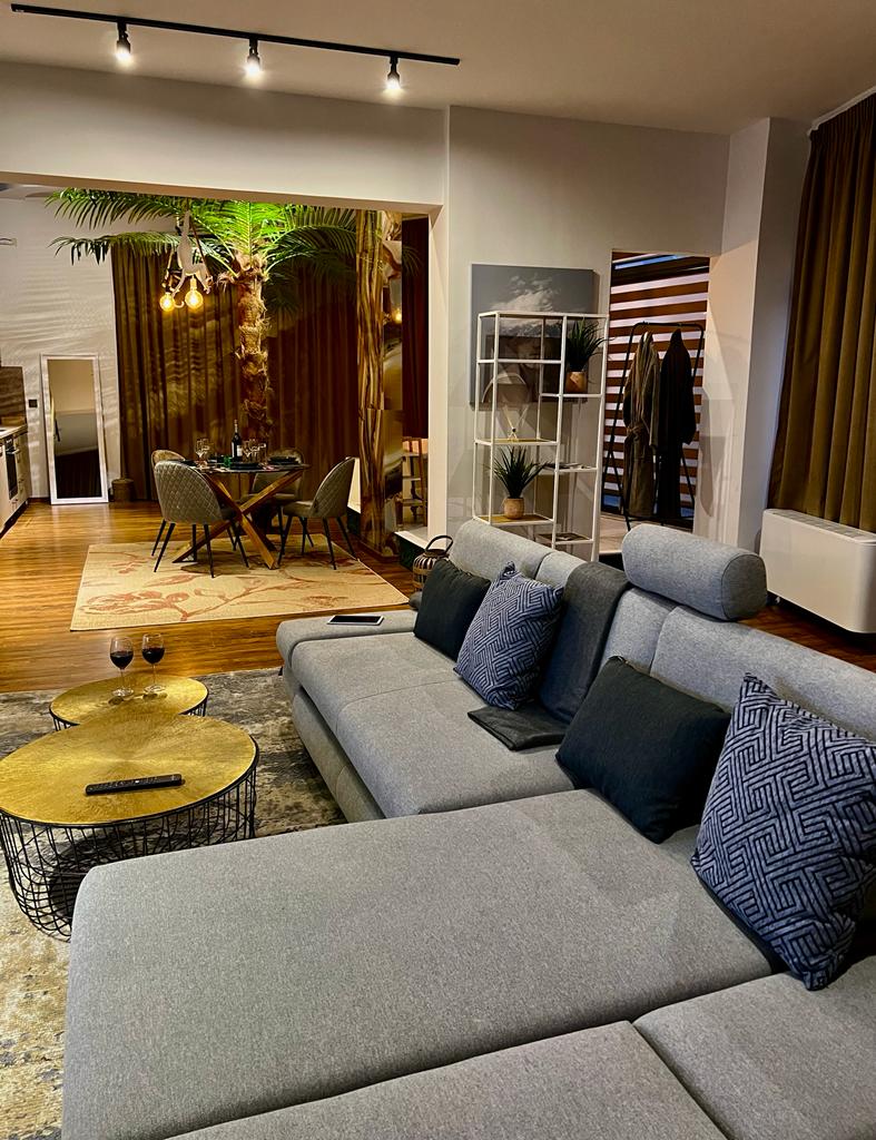 Романтичен и уютен апартамент с всякакви удобства за най-добър и релаксиращ престой. Оборудван със смарт телевизор, допълнително музикално озвучение, смарт система за управление, таблет и осветление. Трапезария и кухненския бокс с напълно оборудван кът, пробори, сервиз за хранене, тостер, кана за чай, кафе машина и консумативи за тях. Вана във всекидневната с пановамен изглед към града и залезите. Спалня с кът за гримиране и смарт телевизор. Целият апартамен е с панорамна гледка.