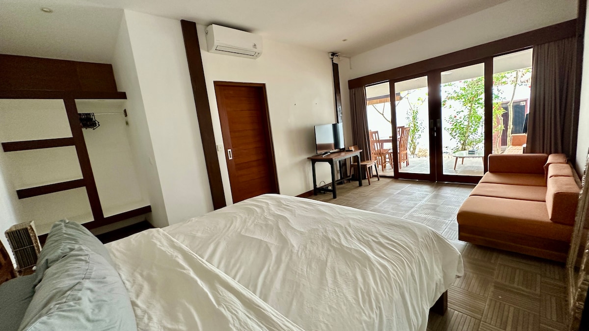 Luxurious private villa with 6x3 meter pool. Secure, private, safe. Lush garden and sheltered but open air kitchen for dining and relaxing by the pool. Queen bed, outside tub and shower, with fish pond view, fully equipped kitchen. AC, TV, great WiFi, daily cleaning and set breakfast is included. We are an 8 minute walk from the main road, or a short scooter ride. This means peace and quiet, and no car noise. Our staff will be happy to drive you in by scooter if needs be.