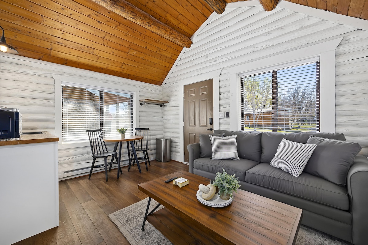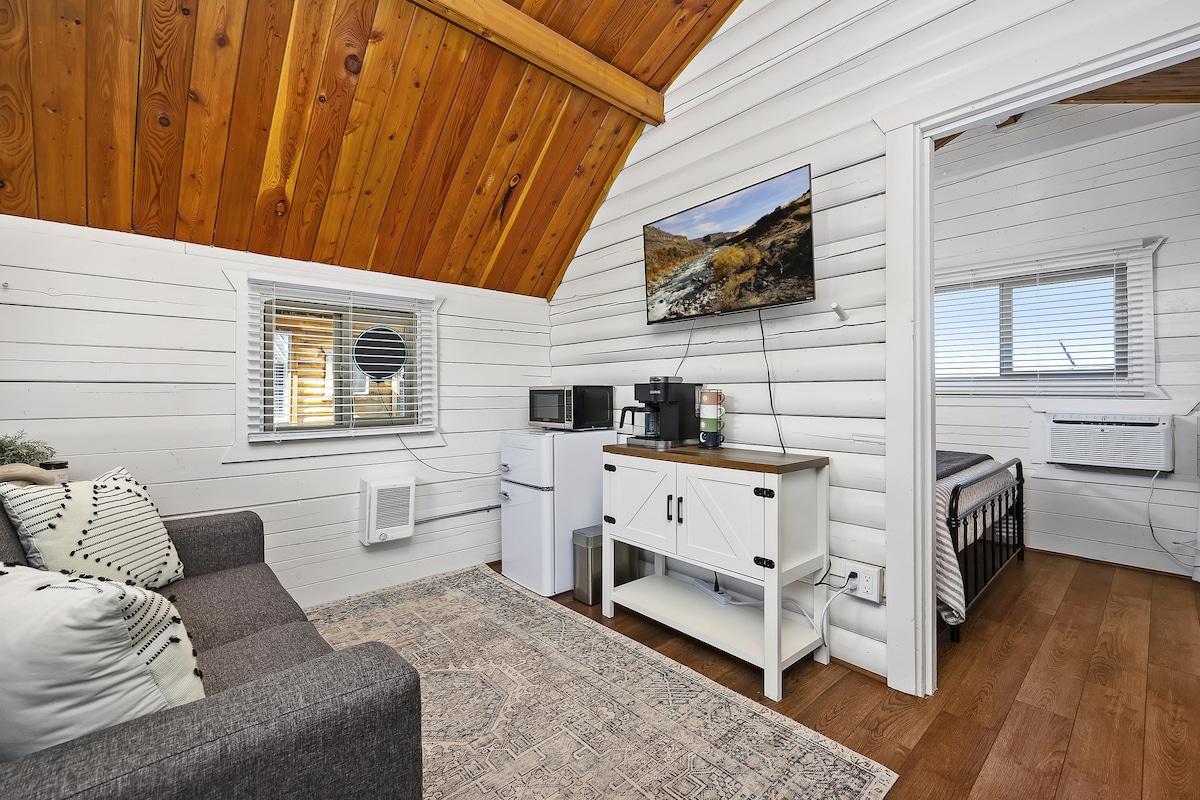 Welcome to the Riversong Retreat Cabin at the Hagerman RV Village! This stylish 214sf *cold water* only cabin can sleep up to 4 guests on a queen size bed or bunkbed with 24hr access to our spotless, private communal showers. Perfect for a small family or couple’s retreat. Stream your favorite movies on the smart TV or relax on the porch. The village also offers a newly remodeled clubhouse with pool table, foosball, dining tables and entertainment area.